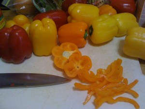 In a large sauce pan on medium heat, sautee the peppers and onion and garlic with olive oil and throw in some chopped parsley. The peppers will reduce down significantly, and there may be some water in the pot. If so, drain the peppers then go to the next step.