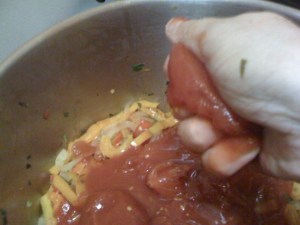 Put the small can of tomato puree in there as well and let it simmer for at least a half hour.