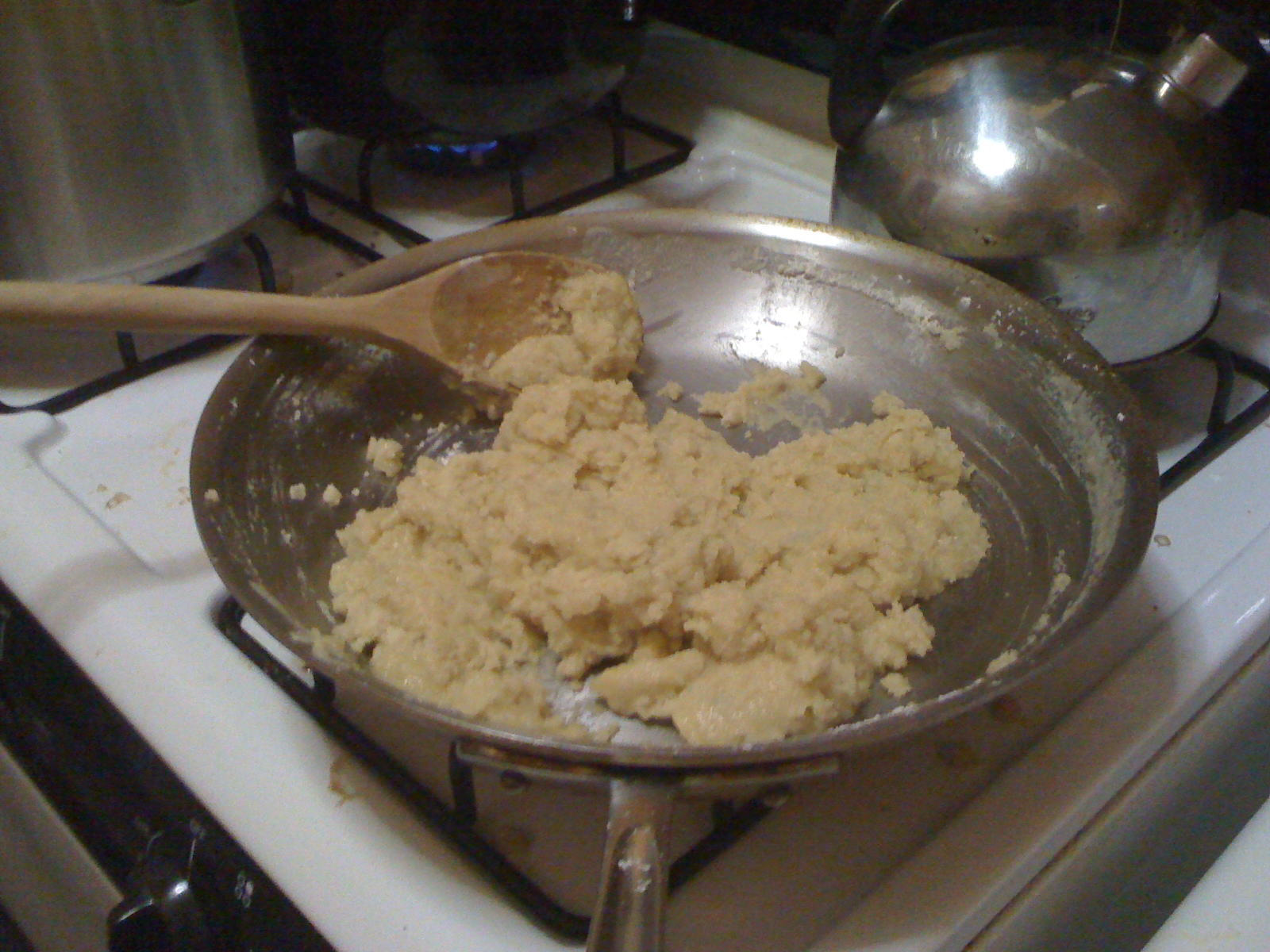 Melt the butter on low with the garlic. Then you want to add flour until the mixture is dry, like a dough almost.