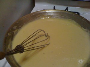 Now you’re going to thin out the rue, which you do by adding chicken broth and whisking whisking whisking. This process is labor intensive, and requires concentration.You have to do it on low heat. Whisk and then let it bubble and then whisk some more. Keep whisking until it has the consistency of Alfredo sauce.