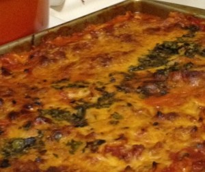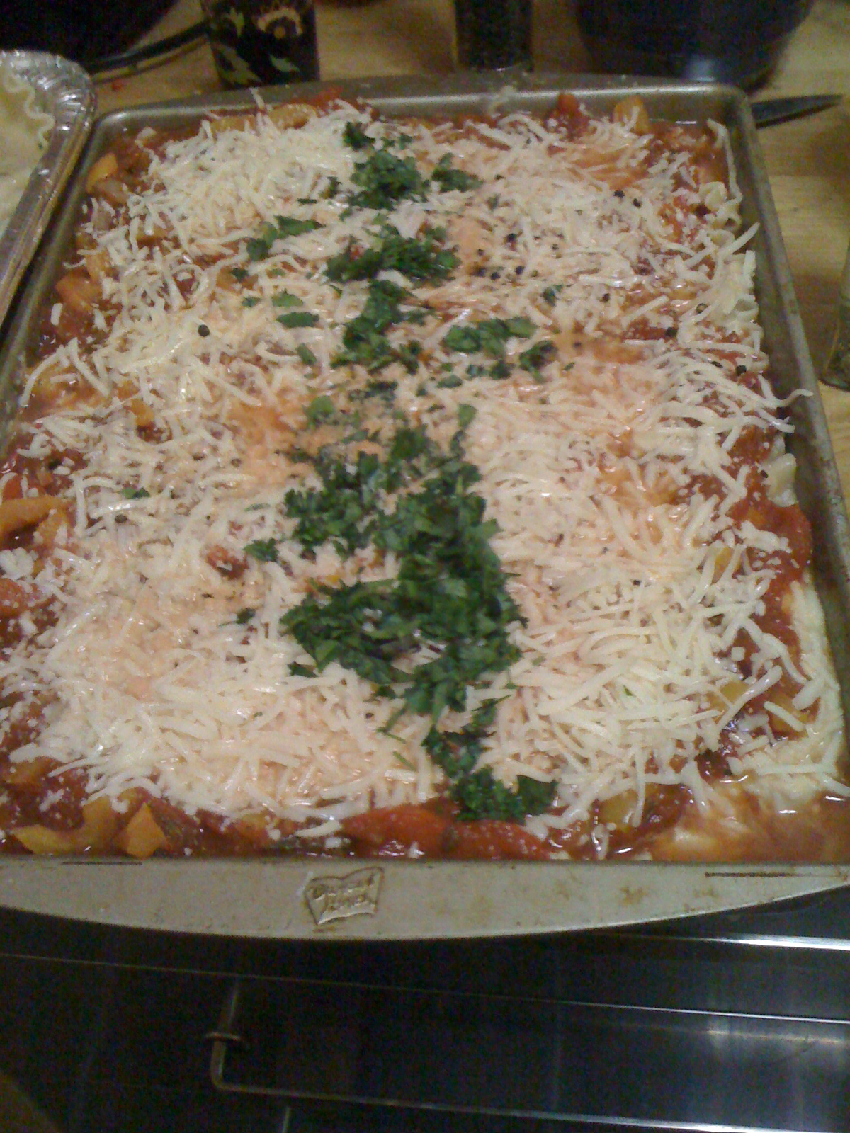 Now you’re ready to assemble. Line the pan with lasagna noodles, then the chicken sauce, then mozarella cheese and the bell pepper sauce. Repeat as much as you can. Be sure to finish it with a layer of cheese! Stick it in the freezer, bake it for 45 minutes at 350, or give it to friends.